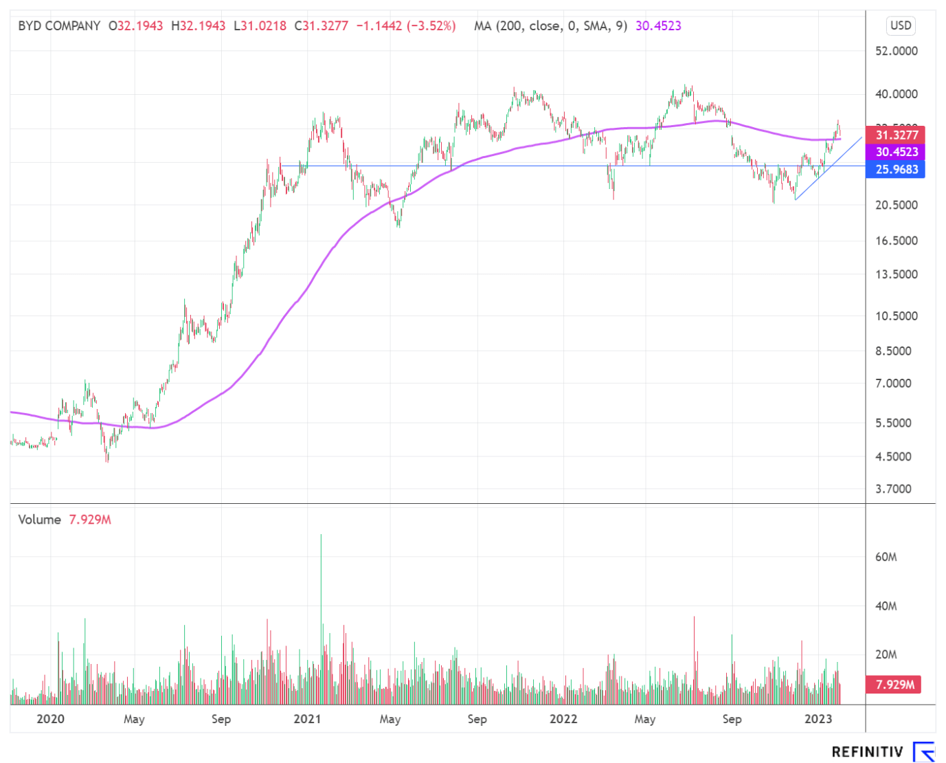 After solid growth in the past fiscal year, analysts predict BYD should continue to grow faster than the overall market at over 30% in 2023 and further expand its market leadership in China. However, both the cancellation of subsidies by the government and price cuts by competitor Tesla are putting pressure on margins. From a chart perspective, the BYD share is in a correction after the strong increase of 58% since the end of November, which could lead the price back to the uptrend at around EUR 28.