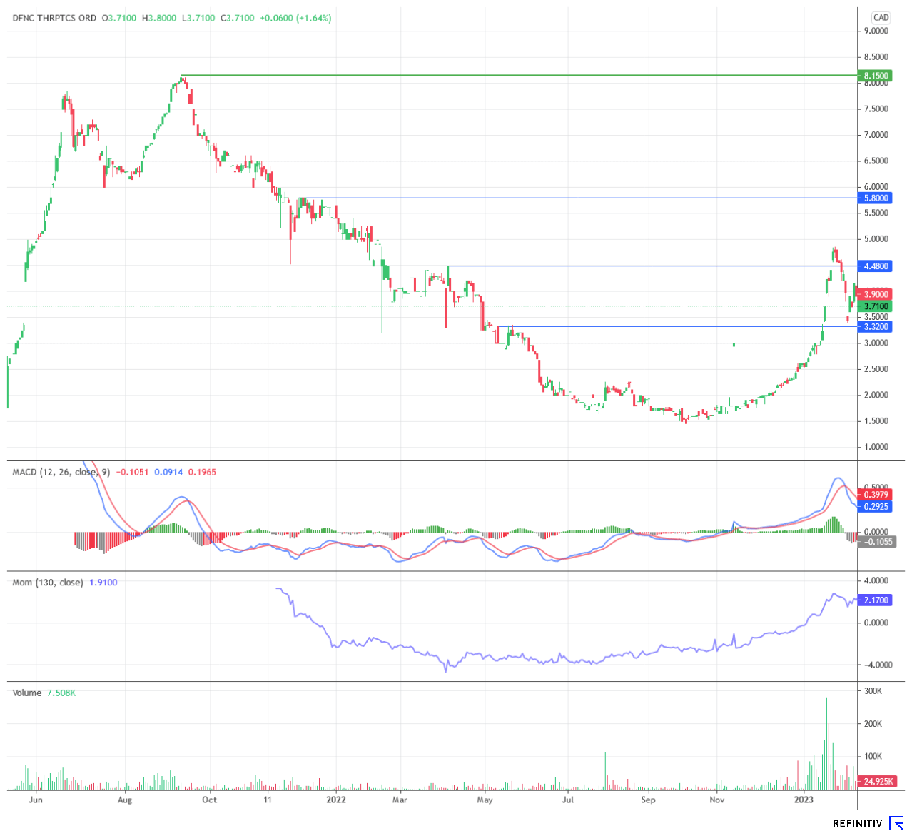 Technically, the shares of Defence Therapeutics continue to be on the upswing. After a dynamic price rally in January, the stock entered a consolidation movement but is holding exceedingly stable at the current level. In view of the takeover fantasy noted by several analysts in the biotech sector, as well as the numerous projects that Defence Therapeutics intends to advance in parallel in 2023, the share is always good for building up new momentum. Even the previous all-time high of CAD 8.15 is within the realm of possibility - provided operational progress is made. The most recent lows offer themselves as hedging opportunities.
