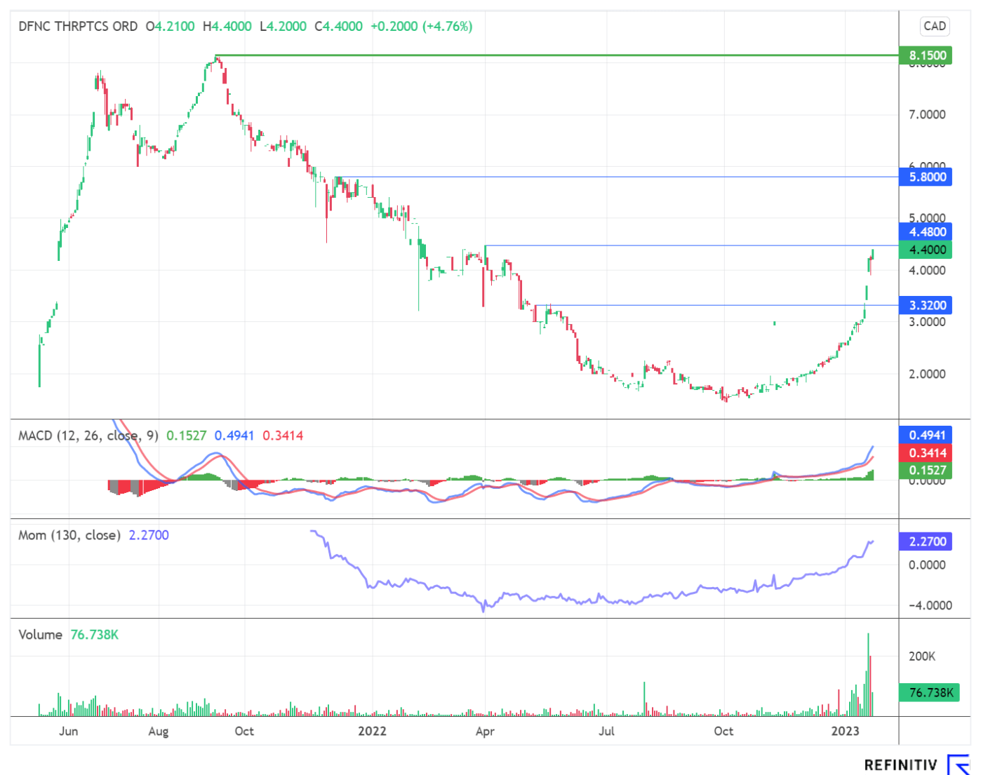 From a chart perspective, Defence Therapeutics presents a promising picture. The moderate uptrend established in the fall has been exited to the upside. Also, two breakaway gaps suggest that the market is completely re-evaluating the stock. Momentum and MACD indicators signal momentum and trend strength. The above-average trading volumes also fit into the positive chart picture. If the share succeeds in rising above the CAD 4.50 mark, the way to the CAD 5.80 mark is clear from a chart-technical perspective. Given the momentum and trend strength, even chart marks above this are not unrealistic. On the way there, however, the probability of price corrections will likely increase. In the area of CAD 3.32, the share appears solidly supported - a relapse into the downward trend remains unrealistic given the currently bullish overall picture.