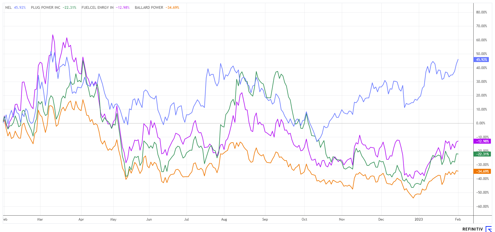 The stock of Nel ASA has risen nearly 50% in just 12 months and is currently performing well in the market. Compared to the H2 sector, Nel ASA has a clear outperformance of over 60%, while peer companies FuelCell Energy, Plug Power, and Ballard Power are lagging behind with -13%, -23%, and -35% respectively, during the observation period. These companies were already the losers of 2022 with declines of up to 75% and have yet to recover.